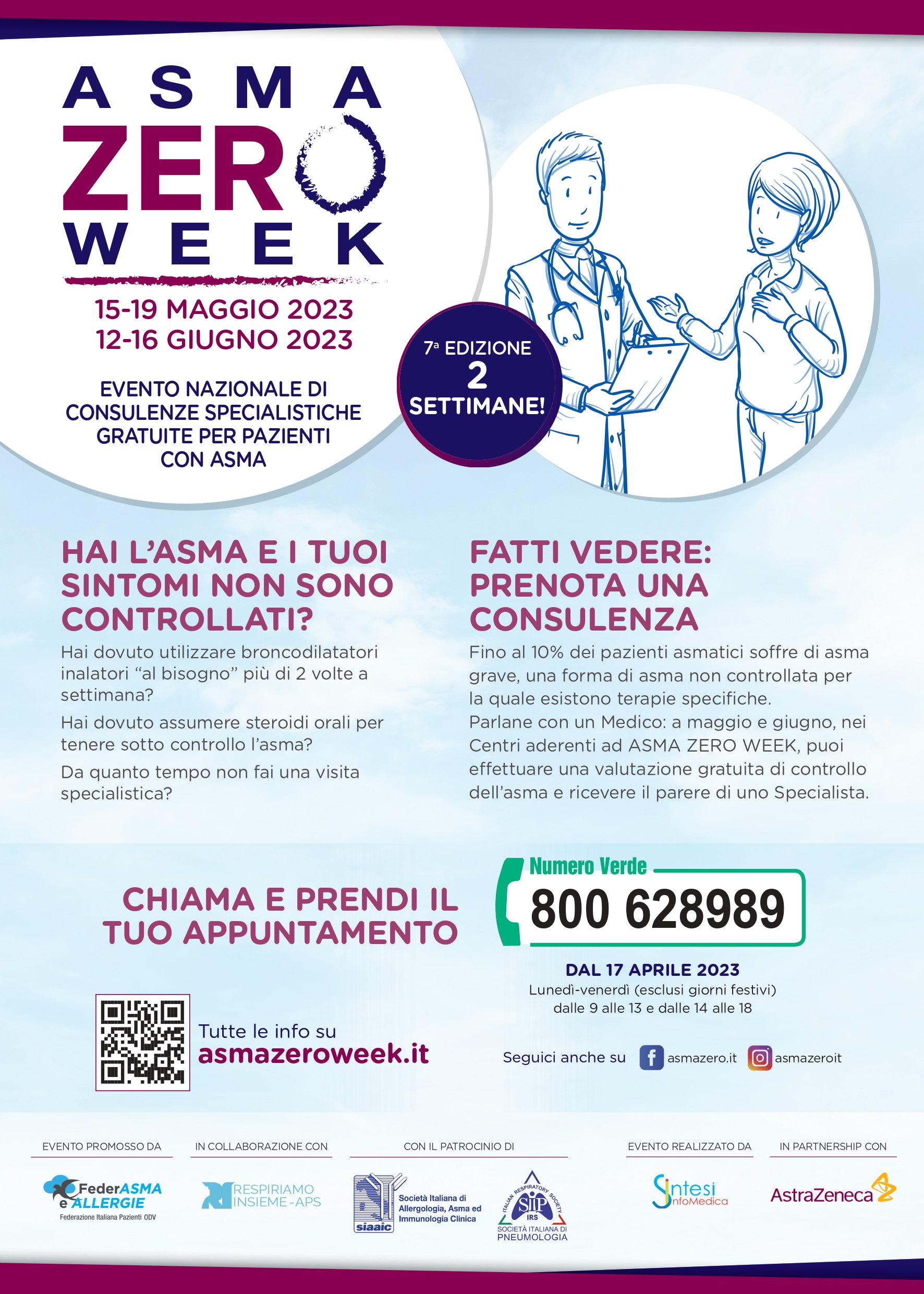 Dal 15 al 19 maggio e dal 12 al 16 giugno 2023, si terrà in tutta Italia ASMA ZERO WEEK: un evento nazionale che offre ai pazienti con asma consulenze specialistiche gratuite. L’iniziativa è promossa da Federasma e Allergie Onlus, con il patrocinio della Società Italiana di Allergologia, Asma e Immunologia Clinica (SIAAIC) e della Società Italiana di Pneumologia (SIP).