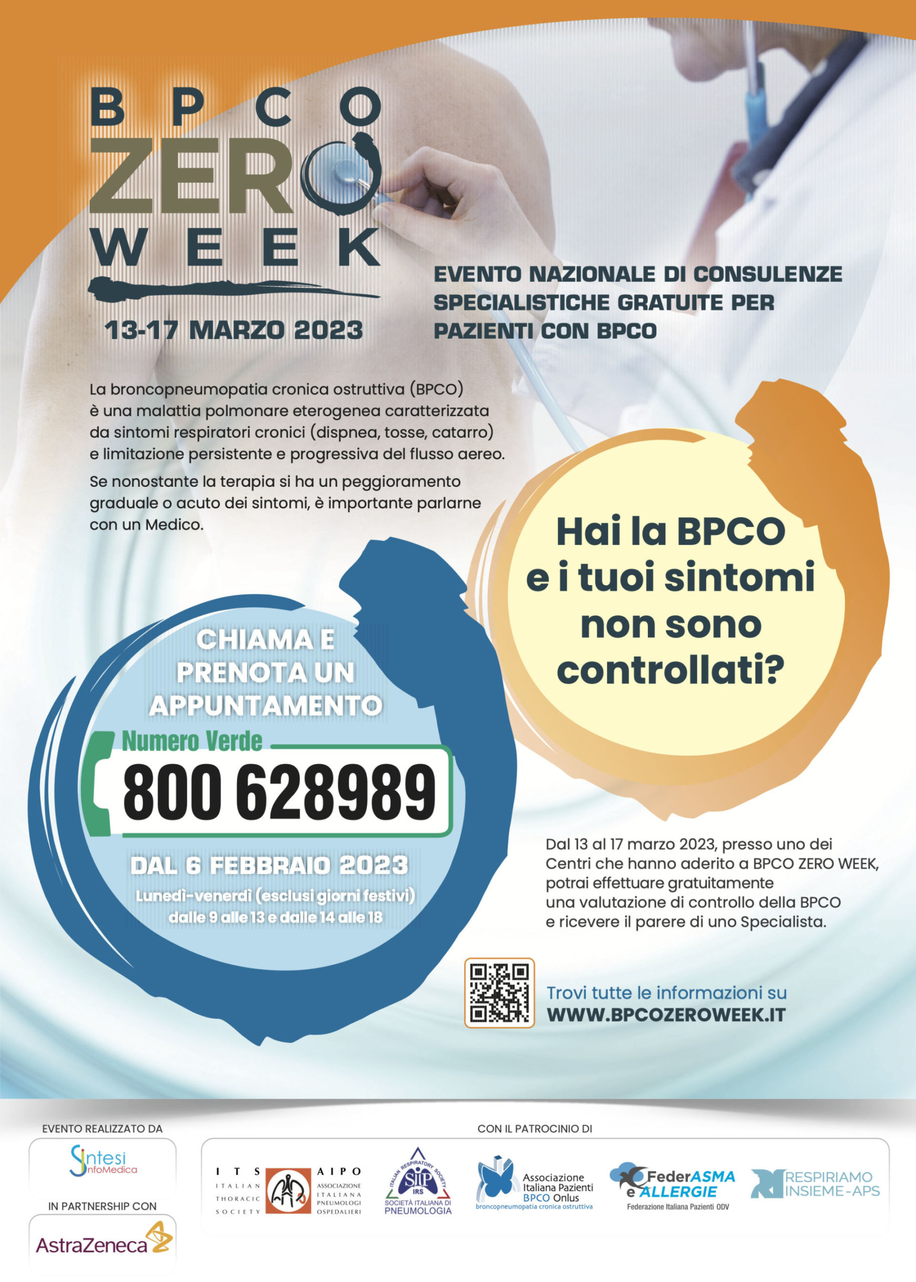 Per sensibilizzare i pazienti con BPCO e i loro familiari sull’importanza di accedere a un’informazione approfondita sulla patologia e sui rischi in cui è possibile incorrere qualora si acceda con ritardo ai trattamenti, prende il via dal 13 al 17 marzo la prima edizione di BPCO Zero Week, evento nazionale patrocinato da Associazione Italiana Pneumologi Ospedalieri (AIPO-ITS), Società Italiana di Pneumologia (SIP/IRS), Associazione Italiana Pazienti BPCO Onlus, FederASMA e ALLERGIE Odv – Federazione Italiana Pazienti e Respiriamo Insieme – APS, e realizzato con il supporto non condizionato di AstraZeneca.