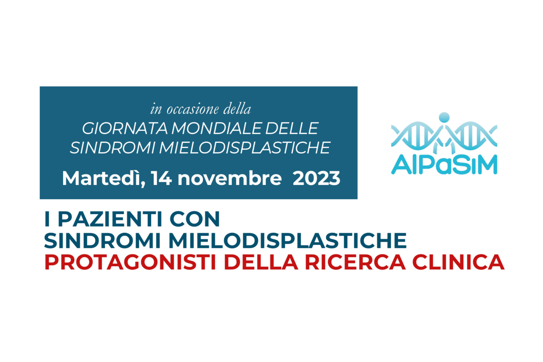 Martedì 14 novembre alle ore 17.45 presso Centro Congressi dell’IRCCS Istituto Clinico Humanitas, AIPaSiM, Associazione Italiana Pazienti con Sindrome Mielodisplastica Onlus, presenterà una guida per la partecipazione agli studi clinici dal titolo “Le sperimentazioni cliniche nelle sindromi mielodisplastiche”.